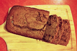 Photos of whole wheat pumpkin bread with chocolate chips.